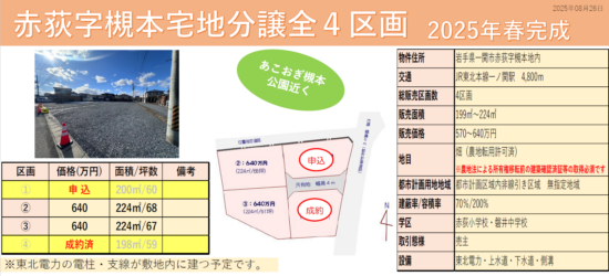 ●住所:岩手県一関市赤荻字槻本地内 ●交通:JR東北本線 / 一ノ関駅 4800m ●総販売数4区画・販売面積 199㎡~224㎡・販売価格 570万円~640万円 ●地目:宅地(農地法により所有権移転前の建築確認済証等取得必須。)●用途地域・建蔽・容積率:無指定 70% 200% ●都市計画:非線引区域 ●学区:赤荻小学校 / 磐井中学校 ●取引態様:売主 ●設備:東北電力 / 上水道 / 公共下水道 / 側溝