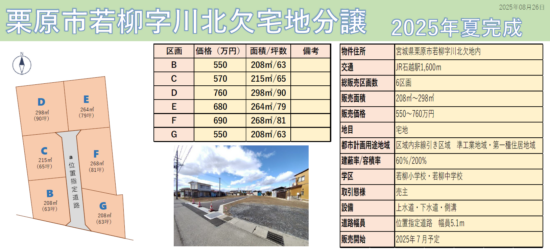 ●住所:宮城県栗原市若柳字川北欠地内 ●交通:JR東北本線 / 石越駅 1600m ●総販売数6区画・販売面積 208㎡~298㎡ ・販売価格 550~760万円 ●地目:宅地)●用途地域・建蔽・容積率:準工業地域 / 第一種住居地域・60% 200% ●都市計画:非線引区域 ●学区:若柳小学校 / 若柳中学校 ●取引態様:売主 ●設備:上水道 / 下水道 / 側溝