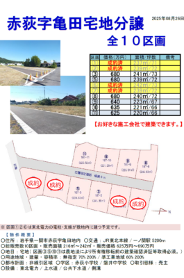 ●住所:岩手県一関市赤荻字亀田地内 ●交通:JR東北本線 / 一ノ関駅 5200m ●総販売数10区画・販売面積 216㎡~242㎡・販売価格 625万円~690万円 ●地目:宅地(区画➂⑤⑩⑪は農地法により所有権移転前の建築確認済証等取得必須。)●用途地域・建蔽・容積率:無指定 70% 200% / 準工業地域 60% 200% ●都市計画:非線引区域 ●学区:赤荻小学校 / 磐井中学校 ●取引態様:売主 ●設備:東北電力 / 上水道 / 公共下水道 / 側溝